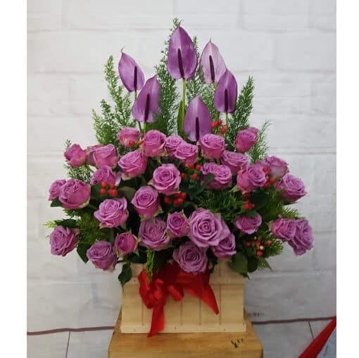 Màu tím vừa là sự mộng mơ, thơ ngây nhưng đồng thời cũng toát lên vẻ đẹp cao quý, sang trọng. Để thể hiện cho ý nghĩa này, lẵng hoa mừng sinh nhật “Thiên Đường” đã lựa chọn màu tím làm màu chủ đạo. Những bông hồng tím được cài kế bên nhau nối liền xung quanh kệ hoa. Đan xen là những tán cây xanh tươi mát, trẻ đẹp cùng vài hạt quả đỏ nổi bật trên nền xanh của tán lá.